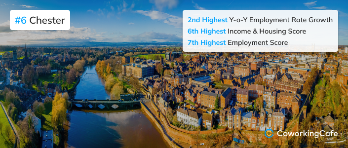 In the income and housing category, Chester ranks sixth nationwide with median earnings standing at £39,200. Meanwhile, rents take up just more than 26% of the monthly income, and typical property prices amount to nearly seven years’ worth of salaries. While this might not make Chester the poster child of housing affordability, it’s one of the more reasonably priced employment hubs on the list. Only Aberdeen and Stafford salaries stretch further in the housing market.