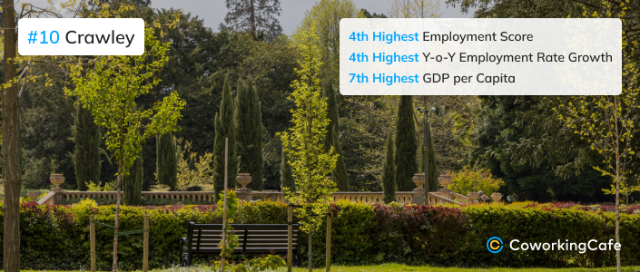 A major business and transit hub with strong ties to Gatwick Airport and its aviation and engineering sectors, Crawley ranks fourth for employment with a robust 83.8% employment rate and a 16.5% year-over-year increase. Here, its economy is driven by major employers such as Thales Group, Boeing, Virgin Atlantic, and Elekta, and job-seekers will find plenty of openings with 125 job postings per 10,000 working-age residents.