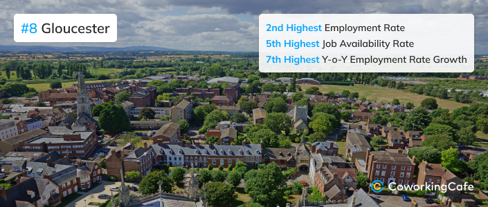Gloucester boasts a strong labor market with an employment rate north of 88%, as well as the seventh-highest employment rate growth. The city also ranks fifth in terms of the number of recent job postings (152 ads per 10,000 working-age residents), signaling steady demand for workers in the aerospace, energy, and insurance sectors, represented by names like Safran, EDF Energy and Ecclesiastical Insurance.