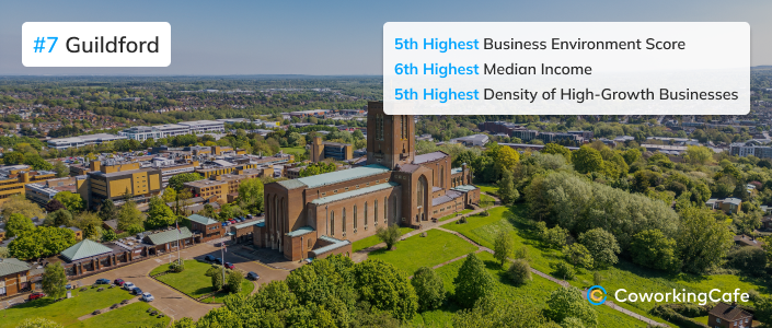 Guildford stands out as a business and innovation hub — particularly in gaming, tech and research — with major employers like Electronic Arts (EA), BAE Systems and Phillips, as well as the Surrey Research Park. Highlighting a strong entrepreneurial ecosystem, the city ranks eighth in business density and fifth in high-growth enterprise density. With median annual earnings at £44,600, it offers strong earning potential, too.
