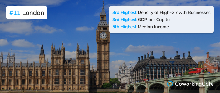 - Its robust business environment secured London’s 11th place overall, far outranking other large cities despite affordability concerns.