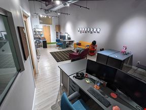 The space includes commercial-grade internet access (250 Mbps down / 90 Mbps up), common area with lounge seating, 4K media center, PC/consoles, and 8'x8' VR area, kitchenette with full-size refrigerator, microwave, snacks, and tea/coffee/cocoa kettle, and is located next-door to a grocery store, dozens of restaurants, shops/services, and a multiplex cinema all within 3 blocks.