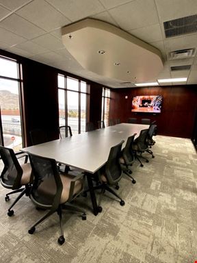 Professional coworking space with individual desks, lounge chairs, tables, and booths. Two conference rooms are available, private offices available, free coffee and snack bar, refrigerator, microwave, and filtered water. Located in executive suite building with easy parking.